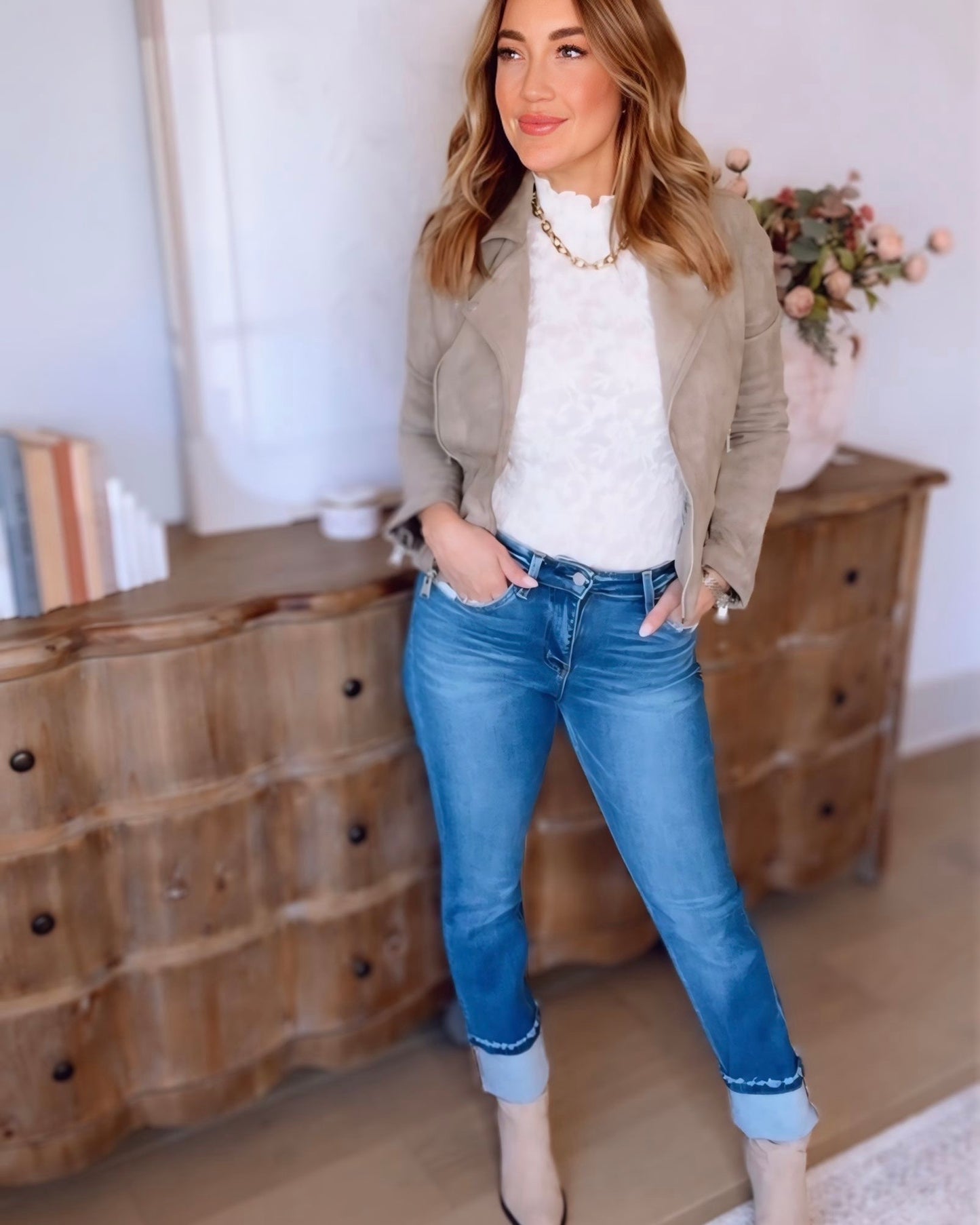 Add a touch of edgy charm to your wardrobe with the Greta Suede Moto Jacket. Crafted from soft suede, this jacket blends comfort and style effortlessly. Its flattering fit and classic moto details make it perfect for elevating any casual or dressy outfit. Stay cozy while turning heads with a jacket that’s as cute as it is versatile.