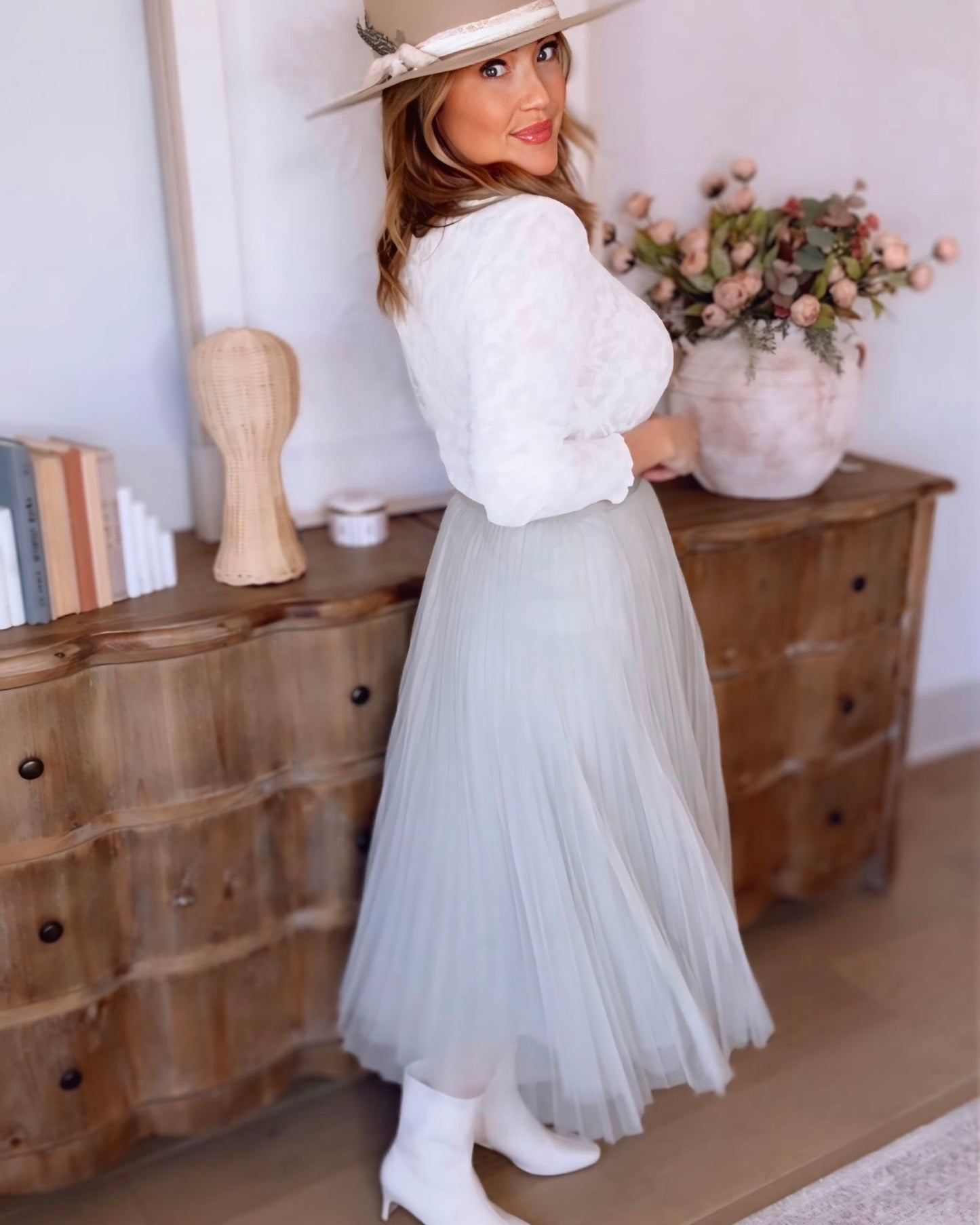 Experience effortless elegance with our Switch It Up Skirt! This sage tulle pleated midi skirt is designed with both style and comfort in mind, featuring an elastic waist for the perfect fit. Its pleated design adds a touch of sophistication to any outfit, making it a must-have for your wardrobe.