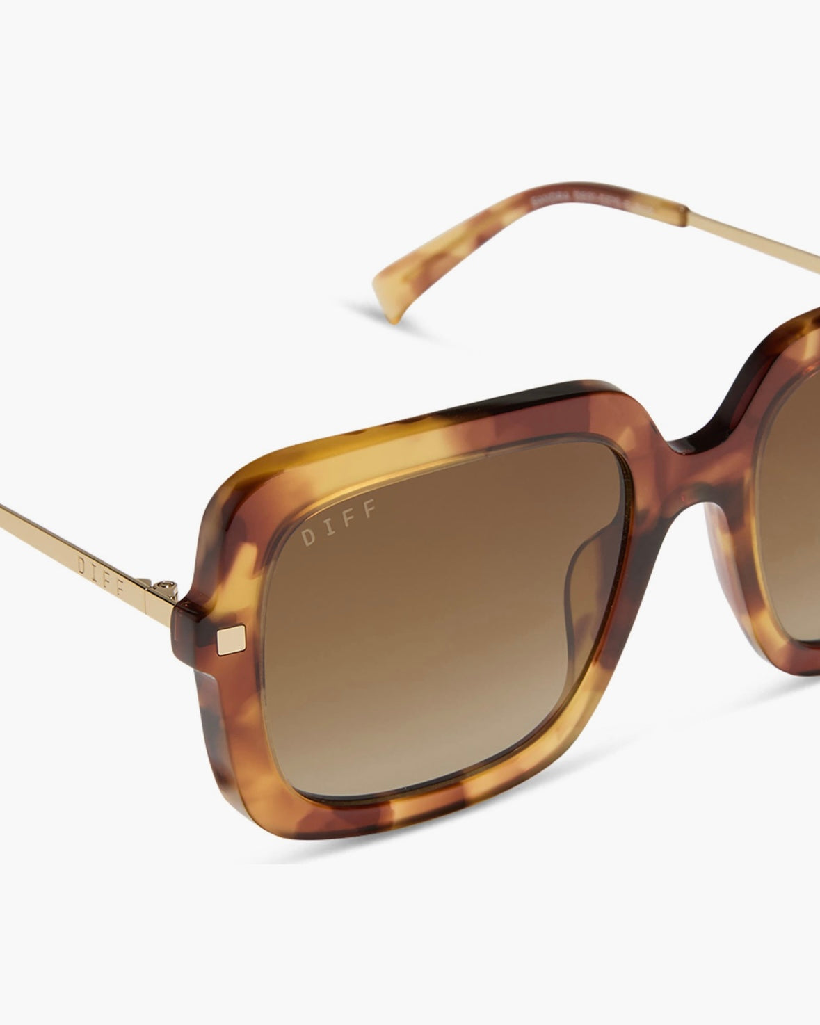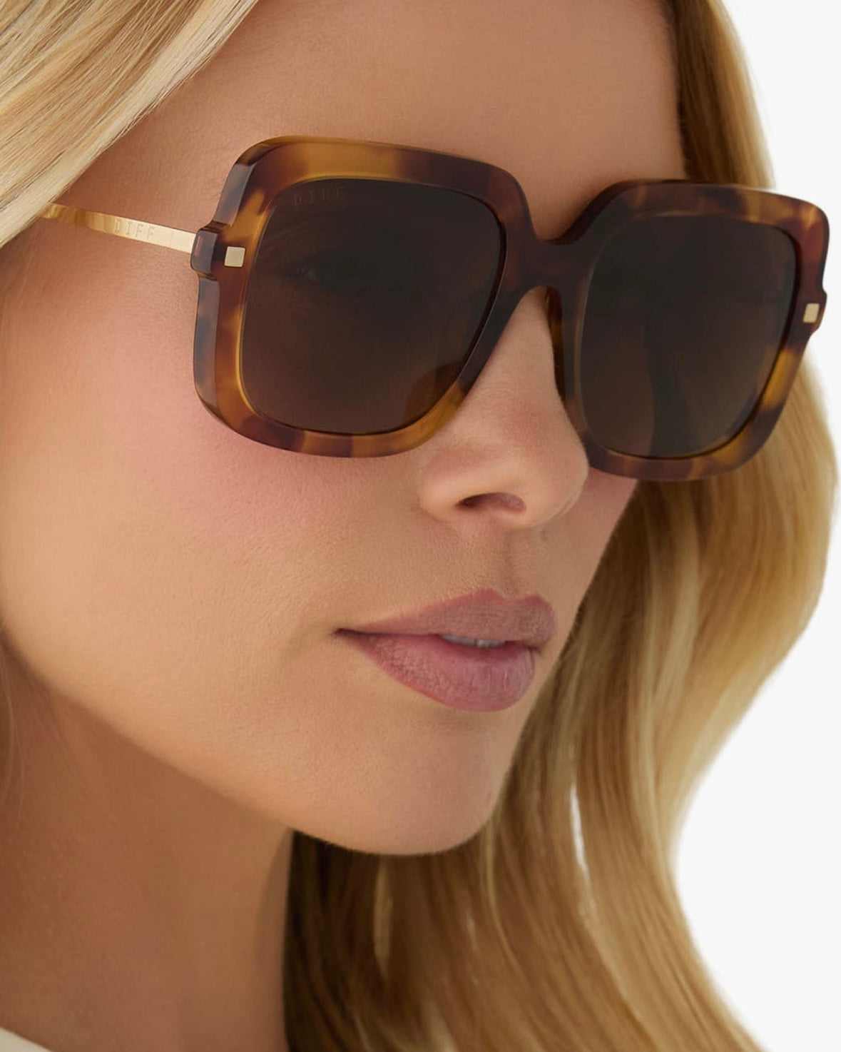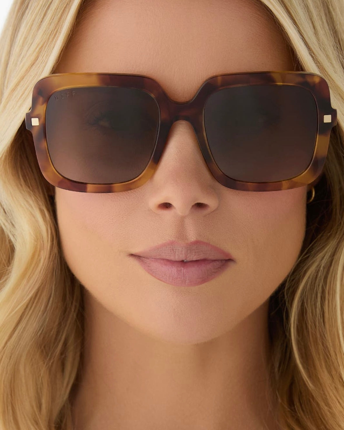 Make a statement with the DIFF Eyewear Sandra in Dark Brown Fleur. These lightweight sunglasses feature a bold, square silhouette that commands attention, while logo-etched temples add an exclusive designer touch. Polarized lenses cut glare for crystal-clear vision, and 100% UV protection keeps your eyes safe under the sun. Style meets substance in this must-have pair.